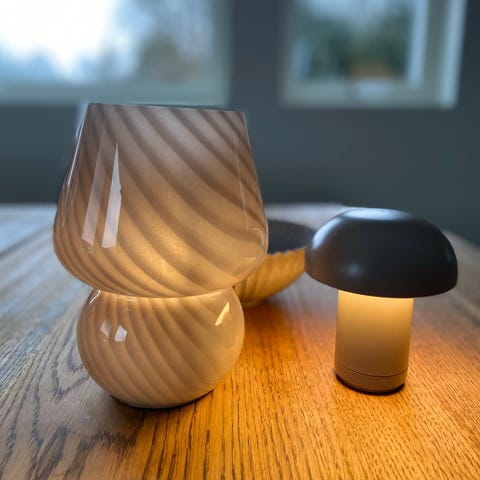 2 små sopplamper i brunt tre, med lun og dimbar belysning. Lades opp med medfølgende lader.