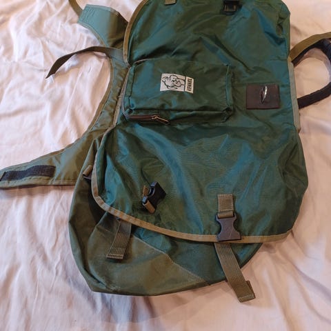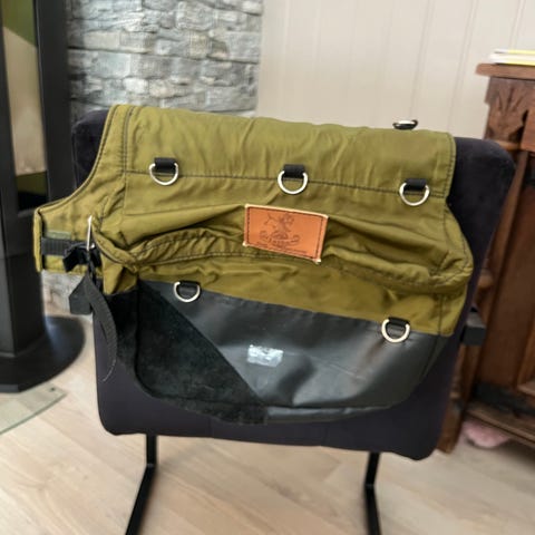 Materiale er syntetisk tekstil med nylonstropper og plastspenner/metallringer. Størrelse er angitt i annonsen.