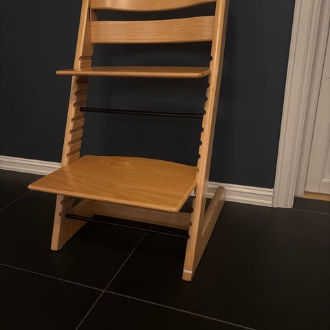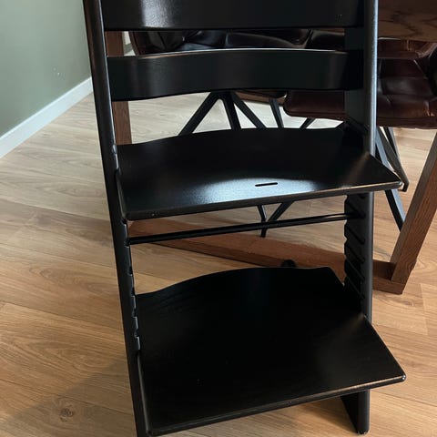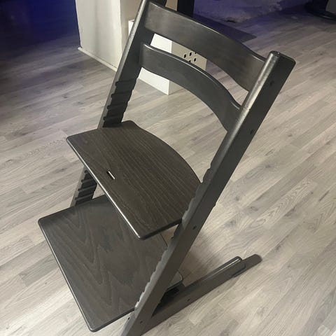 Stokke Tripp Trapp høy barnestol i mørk treutførelse. Klassisk trappeformet stol der sete og fotbrett kan justeres i høyde og dybde for å tilpasses barnets størrelse. Egnet som spise- og sitteplass ved bord for barn som trenger en høyere stol. Laget i tre med stabil konstruksjon og tverrstag under fotbrettet for ekstra støtte. Kr. 1.000,- pr stol / 1.500,- samlet