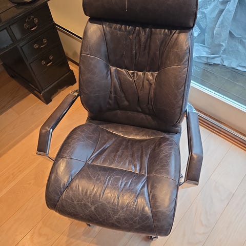 Selger en solid og stilren kontorstol i ekte sort skinn med kromdetaljer og hjul.