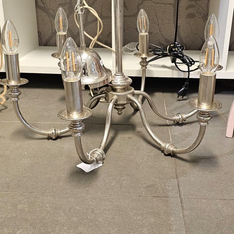IKEA taklampe i lysekrone-stil med flere armer. Lampen er i metall med blank overflate og har hvite lampeskjermer i tekstil/plast. Dekorative plastprismer er festet langs armene og kjeden. Egnet som taklampe i for eksempel stue, spisestue eller gang. Følger med ekstra skjermer. Har stått ute i boden og er litt preget av det