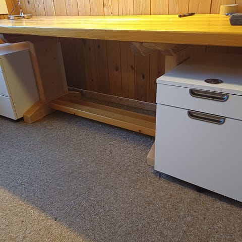 Skrivebord med to skap. Bordet har en rett bordplate og et sideplassert skap med dør og enkel knotthåndtak. Egnet som arbeidsbord eller skrivebord på kontor, soverom eller arbeidsrom. Det er synlig slitasje og hakk langs kanten på bordplaten, som vist på bildene.
