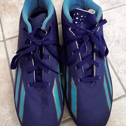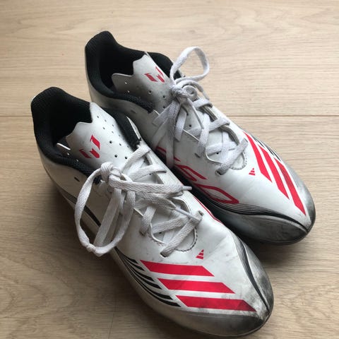 Adidas Messi fotballsko med knotter. Overdelen har blå/lilla grunnfarge med rosa detaljer og «Messi»-print, samt gule Adidas-striper og logo. Skoene har snøring foran og yttersåle med faste knotter til bruk på gress eller kunstgressbaner. Innside i rosa tekstil for økt komfort. Egnet som fotballsko til trening og kamp. Fotballskoene er i størrelse 38