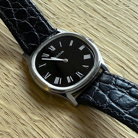 Bulova herreklokke med kronograf og analog visning. Klokken har rund urkasse i metall med polert finish og sort urskive med flere delskiver og kontrastfargede visere. Remmen er i svart skinn med lyse sømmer og hullmønster, og lukkes med klassisk spenne. Modellen passer som hverdags- og penklokke til herre. Svært lite brukt. Ingen skader. Nytt batteri.