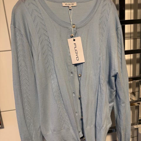 Floyd cardigan i lyseblå selges. Den har nupper på brystet og under armene.
