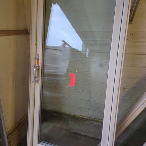 NorDan balkongdør med glassfelt og hvit ramme. Døren har håndtak og låskasse på siden og er laget med karm i treverk og utvendig hvit overflate. Stor glassflate gir godt lysinnslipp og egner seg som utgang til balkong, terrasse eller hage. CE-merking og produktinformasjon fremgår av etiketten på karmen.