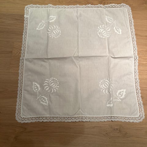 Vakker vintage duk i beige/naturfarget stoff med dekorativ heklet blondekant rundt hele.