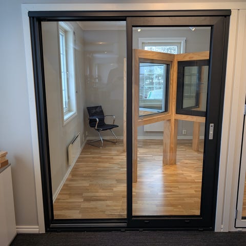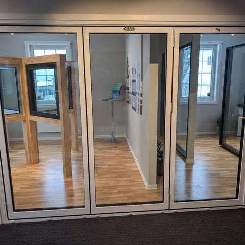 Selger et fullisolert aluminiumsvindu fra showroom.
