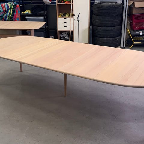 Selger et klassisk dansk spisebord i massiv eik med en illeggsplate. Bordet er i lys eik. Illeggsplaten er original til bordet. Det har samme farge valør, men platen har en livligere eikestruktur.