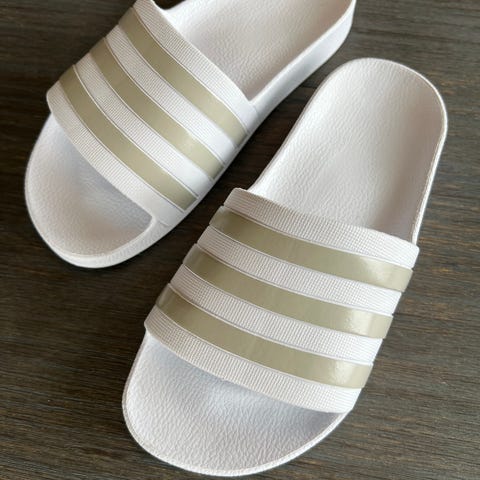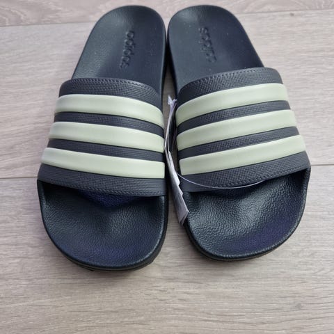 Adidas slippers i størrelse 37. Modellen er en klassisk slip-on badesandal med bred rem over foten. Fargen er turkis med hvite striper på remmen. Sålen er i syntetisk materiale med mønster under for bedre grep. Egner seg til bruk inne, ved basseng, på stranden eller som lette sommersandaler.