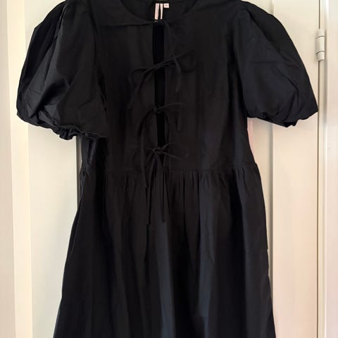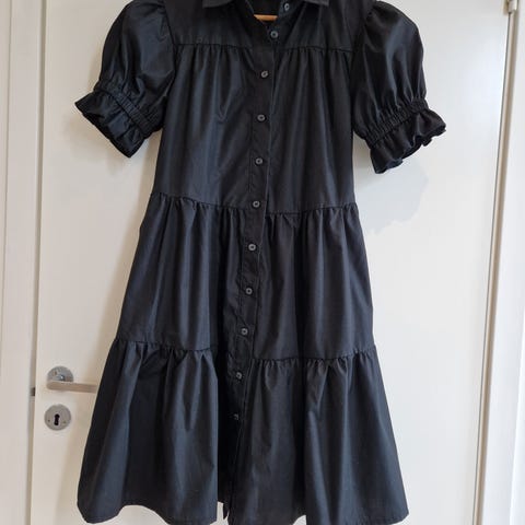 Custommade, dansk design kjole for dame i størrelse S. Kjolen er svart og laget i økologisk bomull. Modellen har korte puffede ermer, høy hals og knapper foran med dekorative perleknapper. Skjørtet er lett utsvinget med rynking fra livet for en løsere passform. Passer til både hverdag og mer formelle anledninger avhengig av styling.