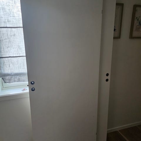 2 stk Hvit innerdør med 3 speil. Døren har forborede hull til dørhåndtak Passer som innvendig dør i bolig, for eksempel til soverom, bad eller oppholdsrom.