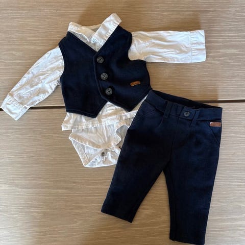 Name it bunadssett for gutt i størrelse 62. Sett i flerfargede toner med bukse og vest i polyester, samt hvit skjorte. Tradisjonspreget design med dekorative knapper foran og mønstrede kanter nederst på buksene. Egnet som penklær til dåp, høytider og andre anledninger der man ønsker et tradisjonelt uttrykk for baby.