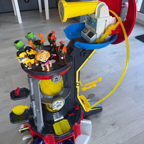 Paw Patrol utkikkstårn lekesett med flere nivåer, sklie og roterende plattform. Lekesettet inkluderer utkikkstårn med heis, rampe og baseplater for kjøretøy. Det følger med seks originale Paw Patrol-figurer og seks originale kjøretøy. Tårnet er laget i plast med flerfargede deler og er egnet for barnelek med Paw Patrol-tema, der figurene kan plasseres i tårnet, sendes ned sklien og brukes sammen med kjøretøyene rundt basen.