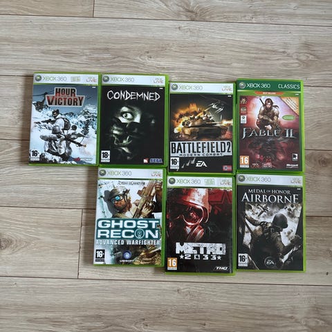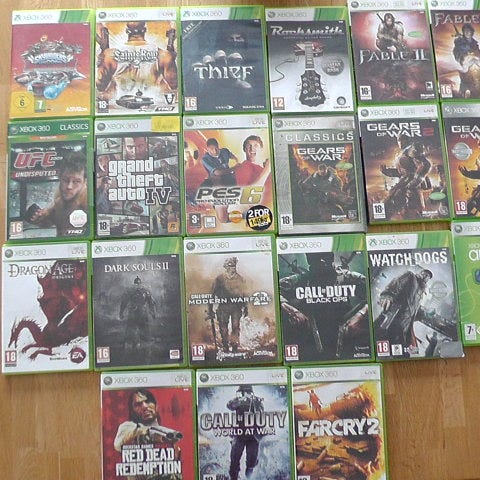 Xbox 360 spillpakke med flere ulike titler i originalemballasje. Spillene er for Xbox 360-konsoll og dekker ulike sjangre som action, sport, bilspill og eventyr. Egnet for brukere som ønsker en samling med varierte Xbox 360-spill. Aldersmerking og innhold varierer mellom de enkelte spillene.