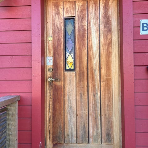 Ytterdør i teak med tilhørende sidefelt i glass. Døren har siden den ble montert ny i 1988 stått godt skjermet for vær og vind og er teknisk i samme stand som når den var ny.