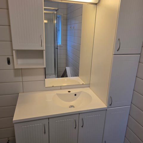 Baderomsinnredning med servantskap og overskap hvit