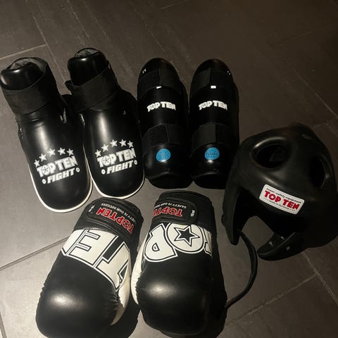Selger nesten ubrukt sparringsutstyr til taekwondo.