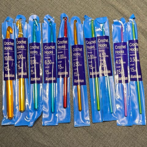 Heklenåler i metall i ulike størrelser. Flere av nålene er tynne og egner seg til fint garn eller arbeid med små masker og detaljer. Noen av nålene er i farget metall, andre i blankt metall. Passer til heklearbeid som klær, tilbehør og interiørprosjekter hvor det er behov for forskjellige nålstørrelser.