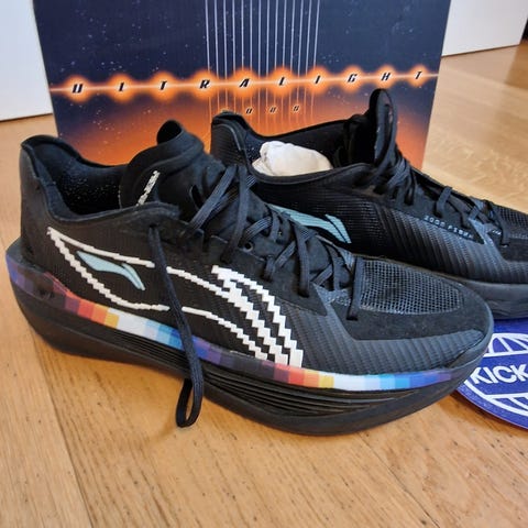 On løpesko i størrelse EU 44. Modellen er en lett løpesko med lav profil og snøring. Overdelen har et flerfarget design i hvitt, oransje og lilla. Skoene er egnet til løping og annen trening. Sålen er utformet for løpsbruk, og innsiden har oransje innersåle med On-logo. Leveres med tilhørende oppbevaringspose fra On som vist på bildene.