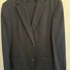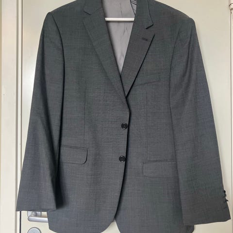 Dress for herre i størrelse XL. Dressen kjennes ut som silke, og har en nøytral gråfarge. Klassisk modell med to knapper foran, jakkeslag og lommer nederst på hver side. Passer til formelle anledninger eller som dress i hverdagen.