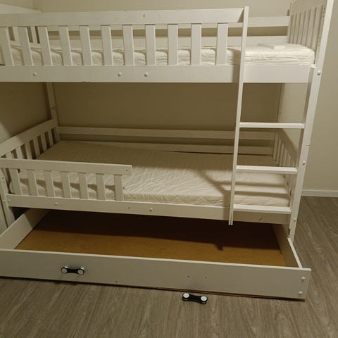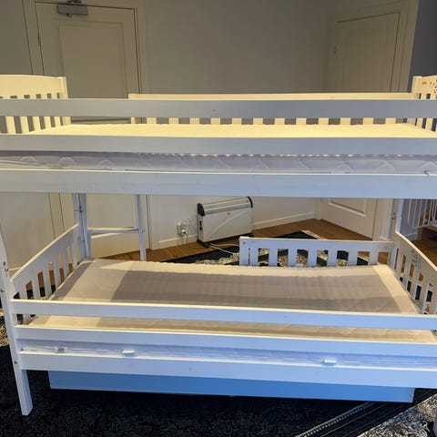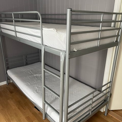 IKEA køyeseng for barn i hvit 90x200 cm. Sengen har to liggeplasser i høyden, med sengebunn av ribber i tre. Innebygd stige på siden gir tilgang til overkøye. Sengen har sikkerhetskant rundt overkøyen. Egnet for standard madrasser i enkeltsengstørrelse (se mål på tegning/bilde for nøyaktige dimensjoner).