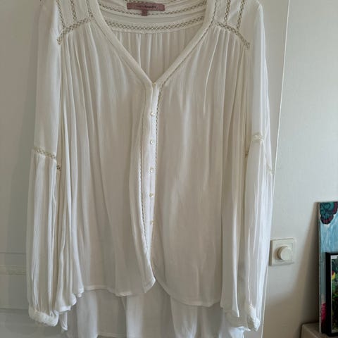 KappAhl bluse for dame i størrelse L. Blusen er hvit og laget i viskose. Den har lange ermer og knappelukking foran. Stoffet er lett og faller mykt, med rynkedetaljer og noe løs passform. Passer til hverdagsbruk eller mer pyntede anledninger, kombinert med bukse eller skjørt.
