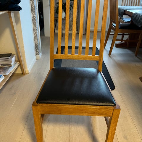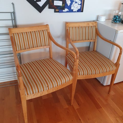 8 spisestuestoler i kirsebærtre fra det italienske firmaet Selva AG. Kr.1.600,-./ kr.200,- pr. stol. To av stolene har armlener. Noen små bruksmerker i stoffet.