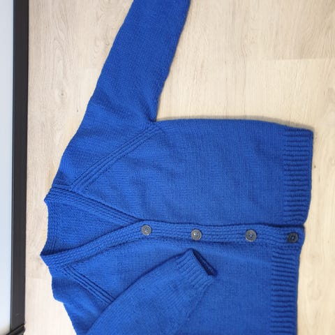 & Other Stories cardigan for dame i størrelse L. Cardiganen er strikket i Dale ull og har rund hals. Den er blå med hvitt mønster øverst rundt bærestykket. Åpen front med klippekant/tråder som kan brukes til montering eller tilpasning av lukning/knapper Passer til hverdagsbruk og som varm lag-på-lag-jakke.