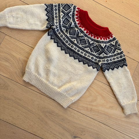 Ullgenser i Mariusmønster kjøpt på Husfliden. Str 4-5 år (104-110). Strikket i Sandnes garn - smart.