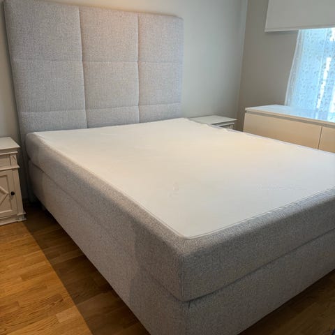 Skeidar seng i grått tekstiltrekk. Sengen har hodegavl og står på ben. Overmadrass i lys farge følger med på bildene. Passer som enkeltseng i soverom eller gjesterom. Følger med gavl
