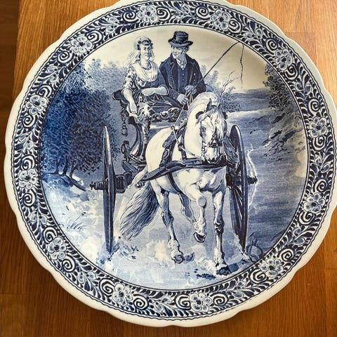 Gammel veggklokke , i emalje, med rund form. Klokken har hvit bakgrunn med blå motiver av landskap og vindmøller rundt tallskiven. Tallene er i sort med tydelig markering av timene, og viserne er mørke. Baksiden har oppheng for montering på vegg. Egner seg som veggklokke i kjøkken. Diameter Ø 27 cm. Pendel ur, med nøkkel. Klokken virker, og går riktig. Men den har hengt på kjøkkenet i nærmere 100 år, så den trenger nok en rens hos urmaker, Pent brukt, ingen skader.