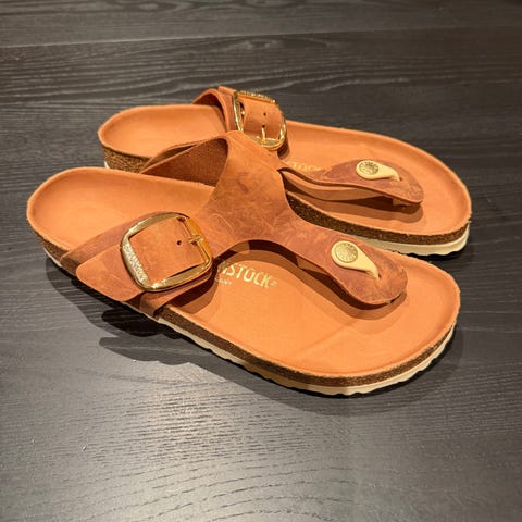 Birkenstock sandaler i størrelse 40. Modellen har to justerbare remmer med metallspenner og formet fotseng. Overdel i svart materiale og såle med mønster for grep. Passer som hverdagssandaler eller innesko.