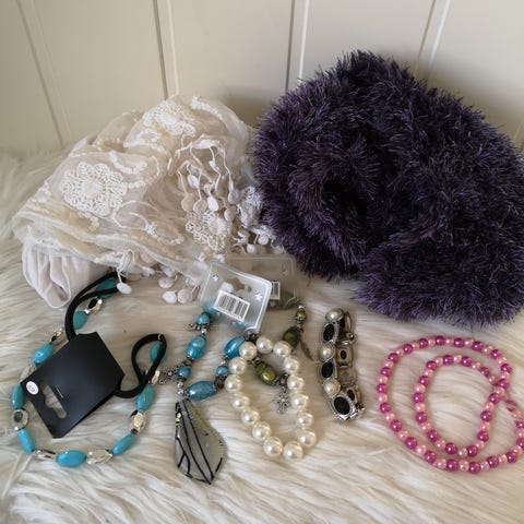 Pakke med 3 skjerf og smykker , lite brukt og noe nytt gis bort. MÅHENTES