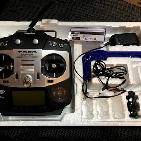 Fjernkontrollen er en Futaba T10CG 2,4 GHz radiosender med skjerm og flere programmerbare brytere og ratt. Senderen har display som viser modellinformasjon, timer og innstillinger for helikoptermodellen. Lader følger med til radio