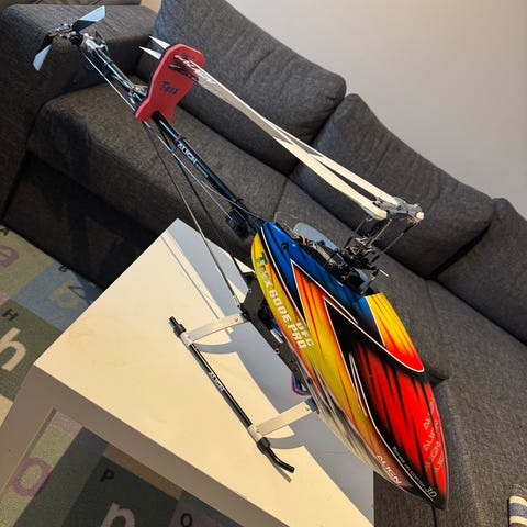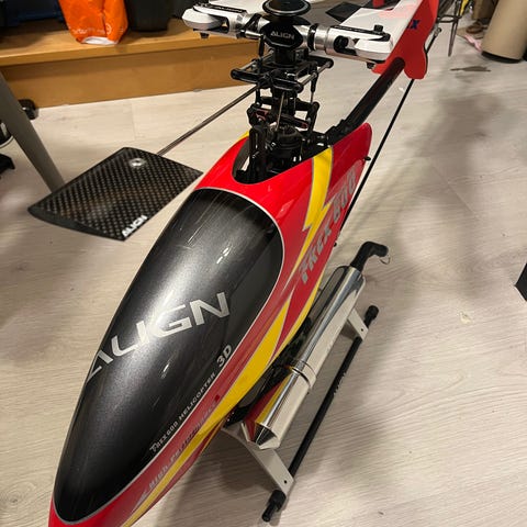Sett med radiostyrt helikopter og sender. Helikopteret er merket Trex 500 og har halerotor, hovedrotorblader og elektronikk montert. Det er installert Futaba GY401 gyro på helikopteret. Batteripakke følger også med