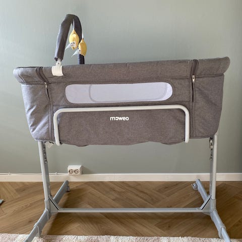 Moweo bedside crib babyseng i grå tekstil. Sengen er beregnet for spedbarn og kan plasseres inntil foreldreseng som bedside crib. Den har justerbare ben og støttebøyle nederst for stabilitet. Myke tekstilkanter gir en avgrenset og trygg liggeplass for barnet. Passer til bruk på soverom ved siden av vanlig seng. Madrass medfølger