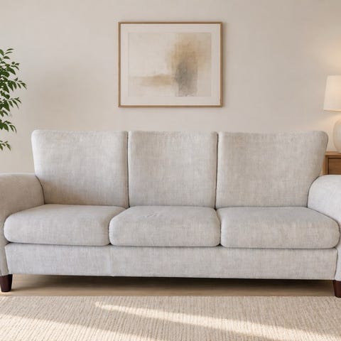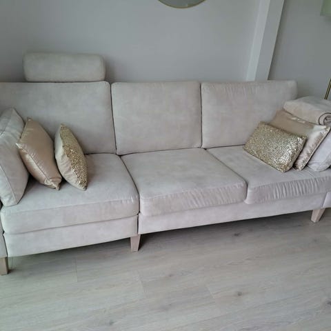 Tekstilen er slitesterk i en nydelig grå/beige tone som passer inn i de fleste hjem. Sofaen fremstår pen og velholdt.