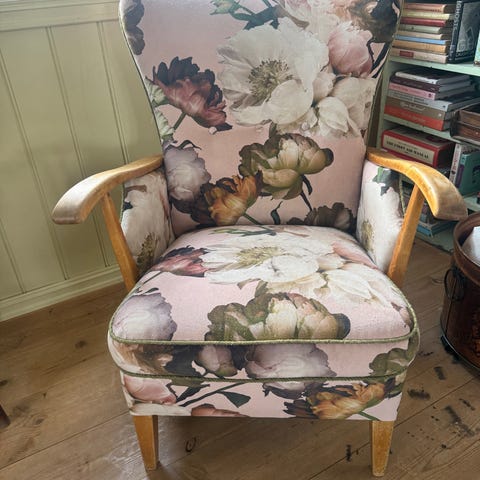 Fine lenestoler fra 60/70 tallet. En pute er litt slitt på venstre hjørne. 1000 pr stk