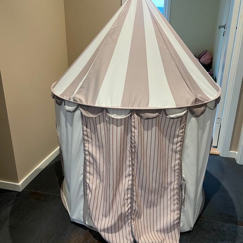 Selger et leketelt til barn i stripet beige tekstil. Teltet har rund form med høy topp og åpning med gardiner som kan knytes til siden. Egnet som lekekrok eller kosekrok på barnerommet. Passer til innendørs bruk.