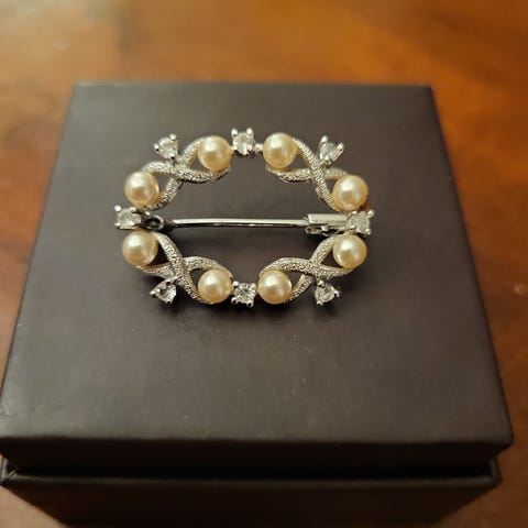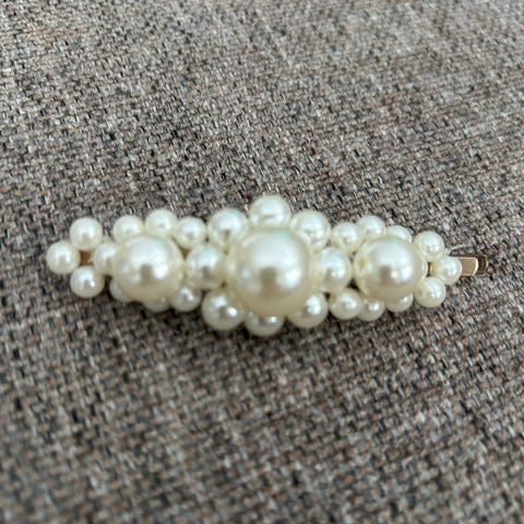 Hårkam med dekor av hvite perler og klare krystall-lignende steiner på gullfarget metallbase. Designet har fleksible grener som kan formes lett i frisyren. Passer til oppsatt hår eller halvoppsatt frisyre ved anledninger som bryllup, konfirmasjon eller andre formelle begivenheter. Kan brukes alene eller kombineres med slør eller andre håraccessoirer.