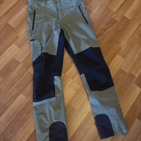 Vikafjell bukse for barn i størrelse 164, unisex. Buksen er svart og laget i polyester. Den har glidelåslommer foran og ekstra lomme på benet. Justerbar linning med knapp og beltehemper. Egnet som fritids- eller turbukse for barn og unge. Den er pent brukt men har et lite hull på kneet. Lett å lappe for de som ønsker. Selges derfor billig.