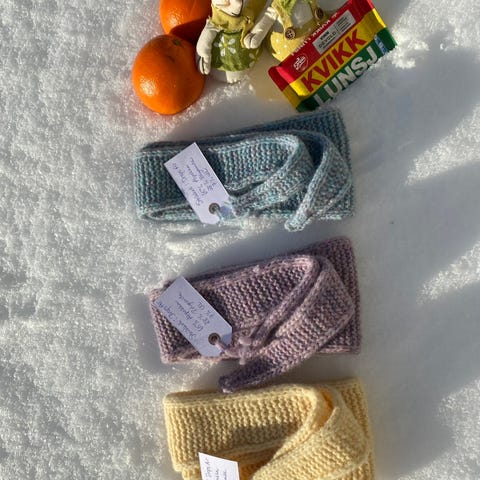 Selger to nystrikkede Sophie scarf i pastellfarger for 175,- kr pr.stk.