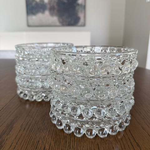 Det er ett glass som har et skår i sølvkanten (se eget bilde) veldig vanskelig å få tatt bilde av mønsteret i glasset og skålene, men har lagt ved eksempelbilder fra nettet som viser mønsteret tydelig.
