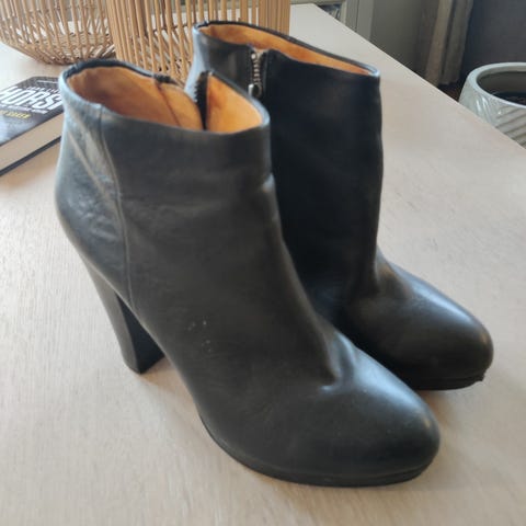 Skoene er ankelhøye med hæl. De har glidelås på siden og remdetaljer rundt ankelen.