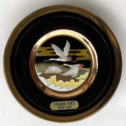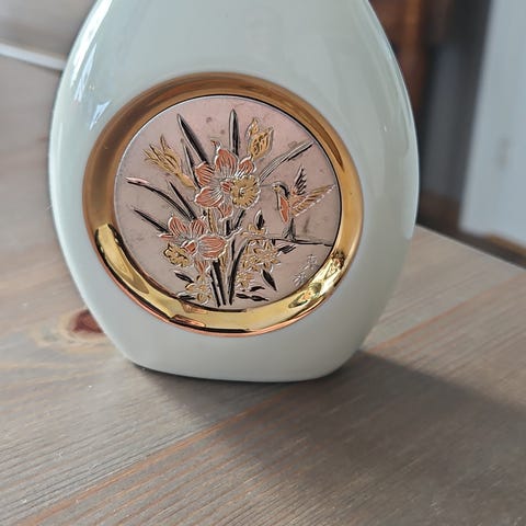 Canarias Chokin vase i svart keramikk med dekor i Chokin-stil. Vasen har motiv med fugl og blomster og er kantet med 24 karat gull. Produsert i Japan. Egner seg som pyntegjenstand eller til mindre blomsteroppsatser.