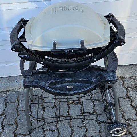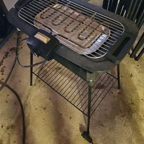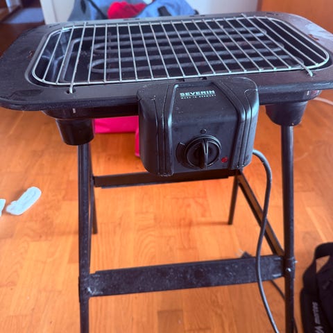 Elektrisk grill på stativ i svart farge. Grillen har rektangulær grillflate med varmeelement og dryppbrett under. Den står på fire ben og har en ekstra hylle nederst for oppbevaring av utstyr. Strømkabel er festet på siden med betjeningspanel. Egnet til enkel grilling utendørs der det er tilgang til strøm.