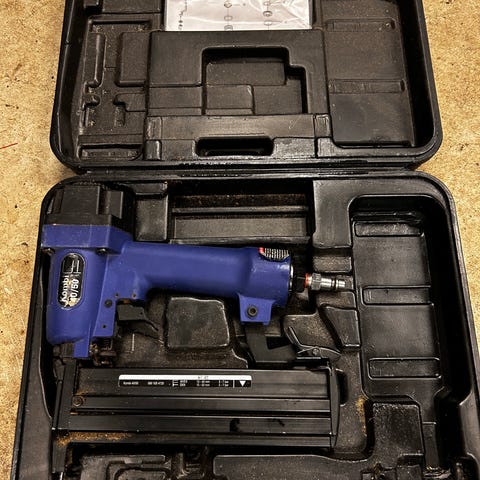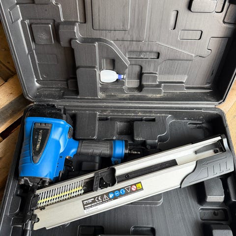 Spikerpistol med plastkoffert. Verktøyet leveres i formstøpt koffert for oppbevaring og transport. Egnet til spikring og festearbeid i tre og lignende materialer der det er behov for rask og jevn innfesting.