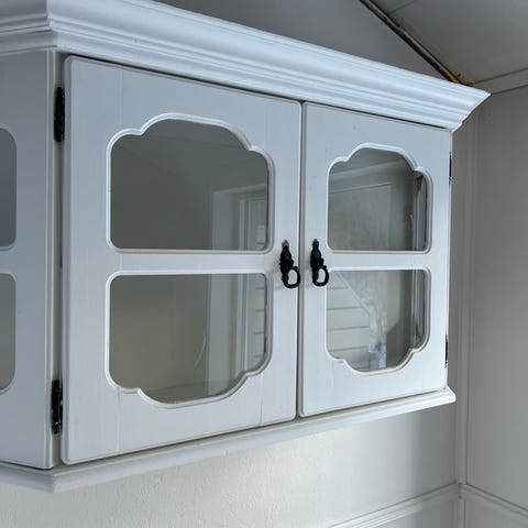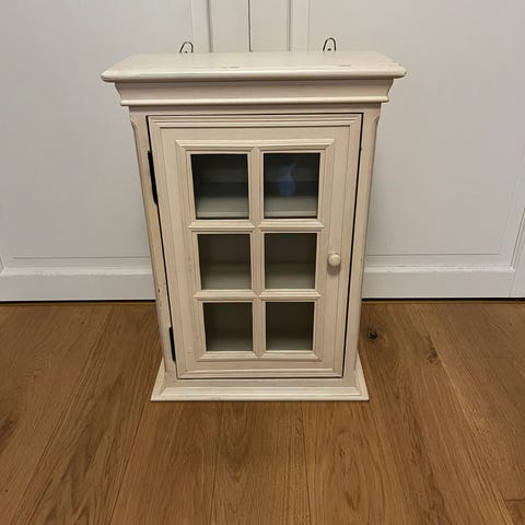 Lite, pent, hvitmalt og antikkbehandlet veggskap med glassdører.