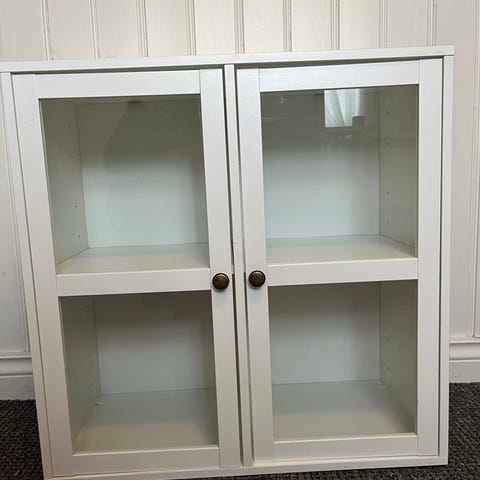 Pent skap i meget god stand. Hvitmalt og antikkbehandlet. To hylleplater som kan justeres opp og ned etter eget ønske. Magnet i toppen som holder dørene godt lukket.